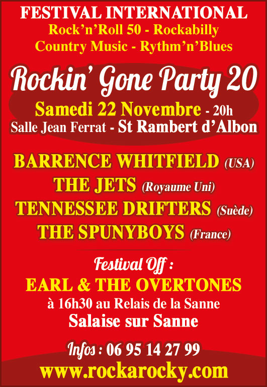 Samedi 22 novembre – à partir de 20h – salle polyvalente Jean-Ferrat – St-Rambert-d’Albon – info : 06 95 14 27 99 – billetterie (25€) : www.rockarocky.com ou magasin Chaussures 2000 St-Rambert-d’Albon ou magasin Eva Music Salaise-sur-Sanne ou offices de tourisme Hauterives / St-Maurice-l’Exil / Beaurepaire / Annonay ou réseaux FNAC, Virgin, Auchan, Carrefour, Leclerc, etc. (sur place 30€ selon disponiblités)