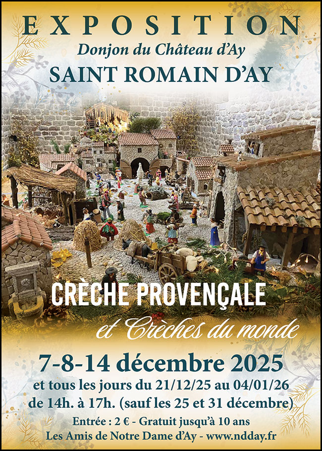 7, 8 et 14 décembre + 21 décembre au 4 janvier (sf. 25 et 31 décembre) – 14h à 17h – Donjon du Château d’Ay – St-Romain-d’Ay – www.ndday.fr – entrée : 2€ (gratuit jusqu’à 10 ans)