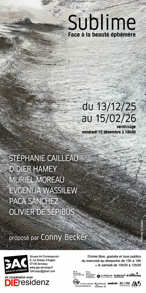 13 décembre au 15 février – mercredi au dimanche 15h à 18h + samedi 10h30 à 12h30 – GAC/ Groupe Art Contemporain (9 rue Boissy d’Anglas) – Annonay – entrée libre – info : https://www.gac-annonay.fr ou gacexpo@gmail.com – vernissage : vendredi 12 décembre à 18h30