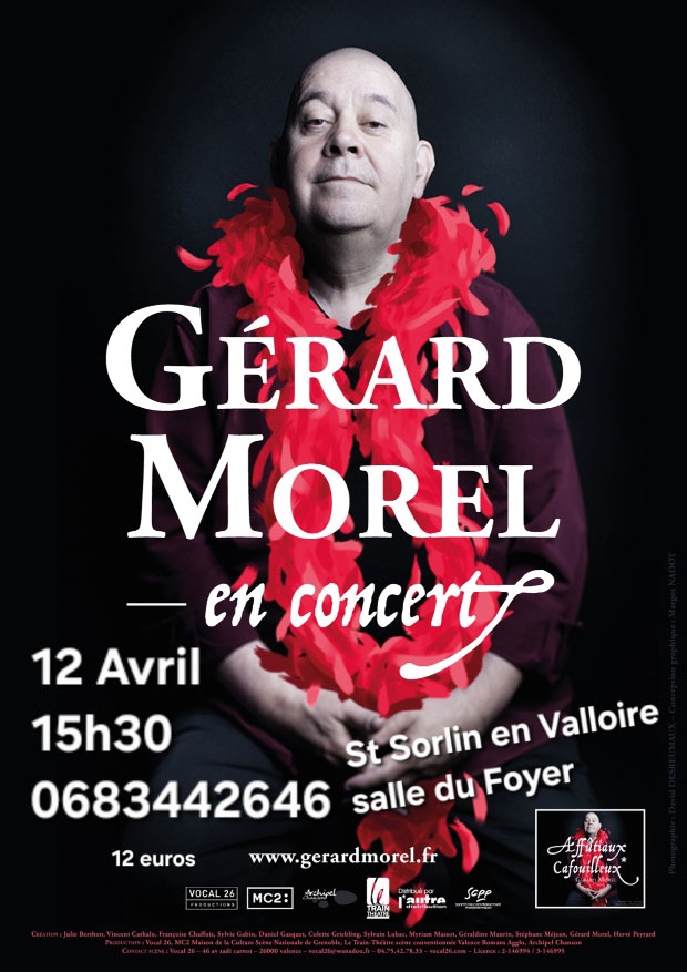 « Gérard Morel est un jongleur de mots. De mots crus en mots doux, il triture la rime, dégomme les syllabes, chatouille consonnes et voyelles pour ciseler des chansons à sa pointure, en phase avec sa bonhomie émouvante et ses éternelles bretelles. Avec un franc pied de nez aux esprits chagrins, Gérard Morel dépoussière la gaudriole et réhabilite les calembours : chanson après chanson, il invente toujours mille et une façons de prendre la vie du bon côté. » www.vocal26.com