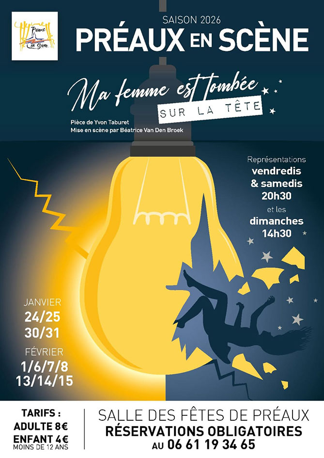 Samedi 24 et dimanche 25 janvier + vendredi 30 et samedi 31 janvier + dimanche 1er février + vendredi 6, samedi 7 et dimanche 8 février + vendredi 13, samedi 14 et dimanche 15 février – salle des fêtes – Préaux – horaires : ven. et sam. à 20h30 + dim. à 14h30 – réservation obligatoire : 06 61 19 34 65 – 8€ (moins de 12 ans : 4€)