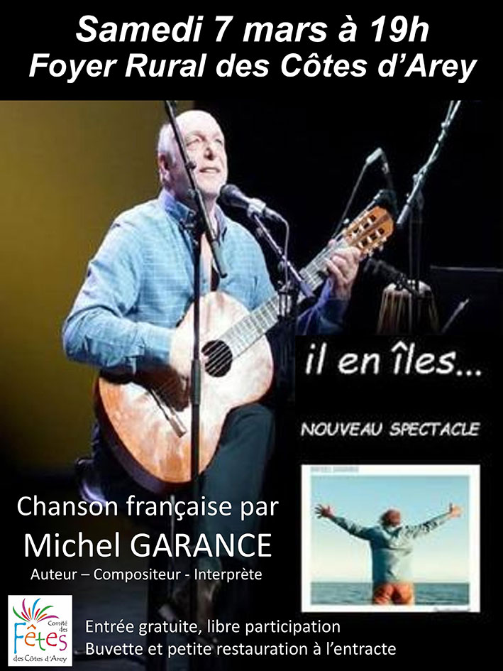 Depuis toujours Michel Garance, Auteur-compositeur-interprète, est attiré par la musique et spécialement par la guitare qu’il pratique depuis son plus jeune âge. Ses voyages, ceux des îles, en particulier ont affûté son regard et la photo est entrée dans sa vie. De la musique à la photo, de la photo à l’écriture, tous les éléments sont réunis pour concrétiser le rêve de l’homme : créer. C’est ainsi qu’il cherche à nous embarquer dans son univers où il côtoie Brel, Brassens, Ferrat, Nougaro, Trenet, Montand, Gainsbourg qu’il accompagne de façon très personnelle, à la guitare. Il a fait deux « Olympia » aux côtés de Michel Murty, de nombreux concerts au sein du duo « Bretelles de luxe » avec Philippe Dardy et plusieurs tournées qui se sont complétées au Festival de Berlin. Il participe aux spectacles « Au fil de l’eau » et « Cœurdialement » autour de ses chansons avec la complicité d’Alain Durandière aux percussions et au piano. Aujourd’hui, il est seul en scène dans un nouveau spectacle « D’il en îles » d’une scénographie qui touche au cœur de l’être.