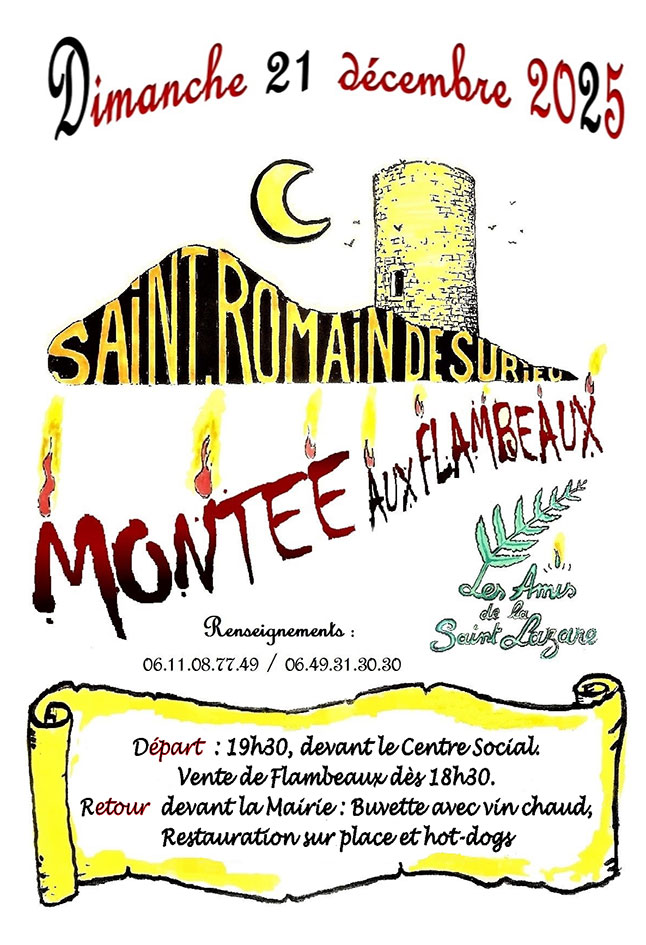 Vente des flambeaux (et bâtons lumineux pour les enfants) à partir de 18h30 sur le parking du Centre Social des 4 Vents et départ pour la montée à partir de 19h30. Parcours à pied d’environ 1 km 800 soit sur la route (entièrement sécurisée) soit par des petits chemins dans le site de la St Lazare. Tout sera éclairé, la tour, l’église, les arbres ajoutant ainsi de la magie à celle des flambeaux serpentant la colline. Des animations lumineuses s’ajouteront au spectacle : moutons éclairés dans un décor féerique, cheval décoré, saltimbanques jouant dans un amphithéâtre de verdure…