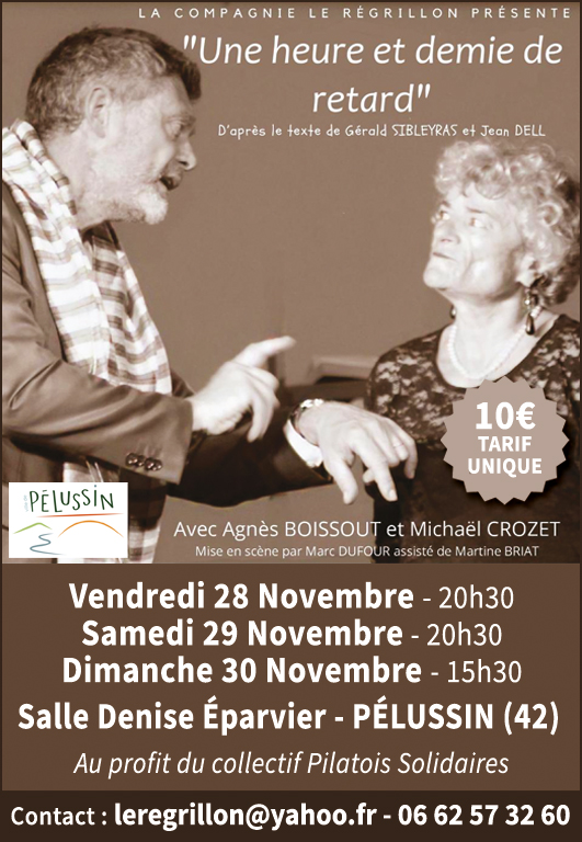 Vendredi 28 et samedi 29 novembre à 20h30 + dimanche 30 novembre à 15h30 – Salle Denise-Eparvier – Pélussin – tarif unique : 10€ (au profit du collectif Pilatois Solidaires) – réservation conseillée : 06 62 57 32 60 – info : leregrillon@yahoo.fr
