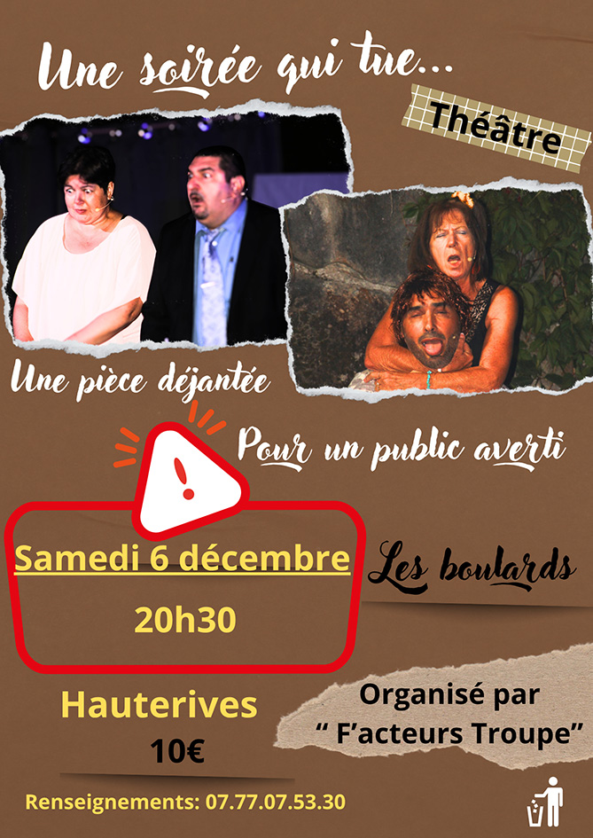 L’association « F’acteurs troupe » d’Hauterives, invite la troupe des boulards de St-Barthélémy-de-Vals » pour « une soirée qui tue ». Une pièce de théâtre déjantée, pour un public averti.